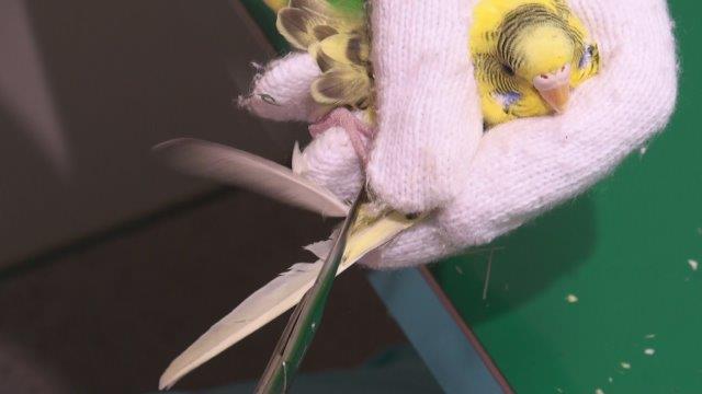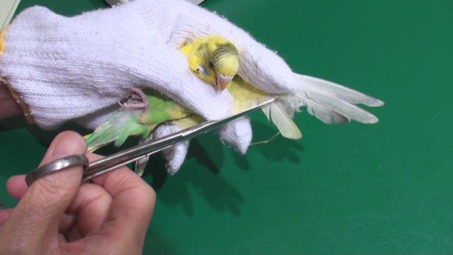 風切羽といわれる外側の羽を残すように切ります。1枚だけだと強度が確保できないので2〜3枚残して内側をはさみで切ります。このようにすると外側の羽は残っているので見た目のがよくなります。また羽の羽軸から内側だけをそいで半分にするやり方もありますが。鳥が暴れることを考えると短時間で済む方法が負担が少ないでしょう。切る場合には成長中の羽がないか確認してから切ります。