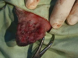 4 外側から全層を貫いて鋼線で細かく縫合する。方向は切皮線と平行にして血行障害を防ぐ。 縫合時に耳介が歪まないようにその結紮の強度を調節しながらおこなうと変形が少なく美容形成上良好な結果が得られる。