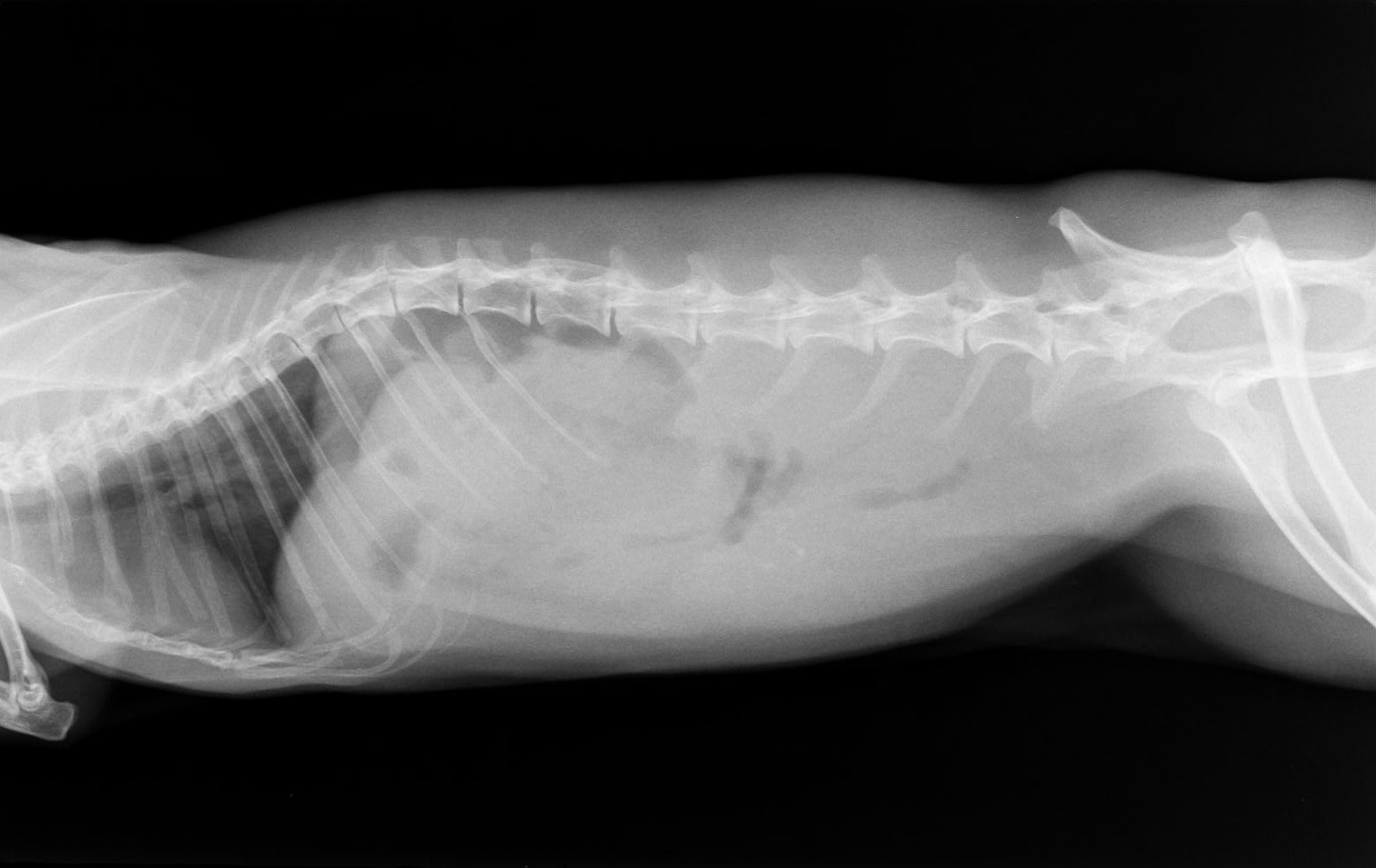 食欲不振のウサギ、食べていないのに胃内に内容物がかなり入っている。盲腸部位にはガスが出ていないので比較的短期間で悪化したことを示している。