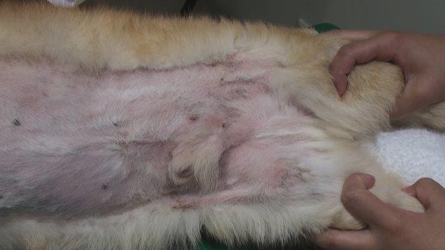 皮膚の化膿性炎症を総称して膿皮症と呼ぶ。軽度なものでは自然治癒するが、感染抵抗性の弱い犬や、本性に対する治療法が不適切だったりすると炎症が悪化し、慢性化しやすい。 化膿部の深さや程度、化膿の原因となる細菌種類、基礎疾患の有無などにより病名が違ってくる おなか全体に赤い湿疹ができている。