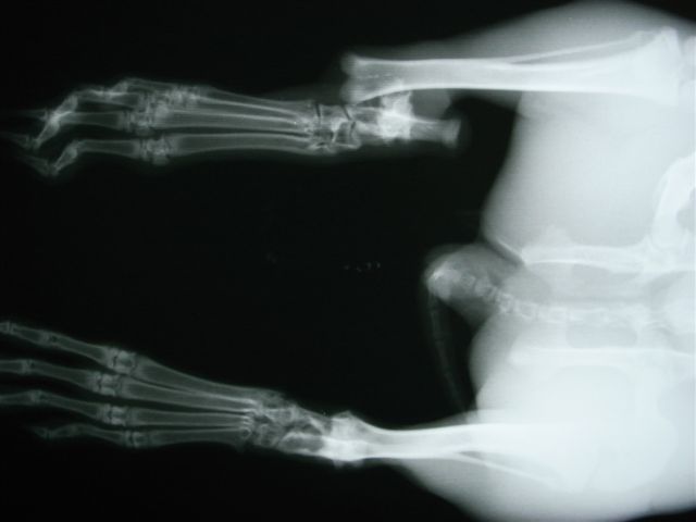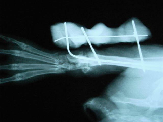 骨折する場所は太股の骨(大腿骨)、すねの骨(頸骨)、背骨(脊椎)です。後ろ足の力が強いために起こります。足の骨の場合、骨の中に金属の棒(ピンニング)やプレートで固定をして外側から固定をして、動かないようにケージに入れておきます(ケージレスト)。1ヶ月から2ヶ月ぐらいかかると思ってください。