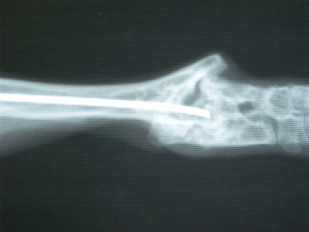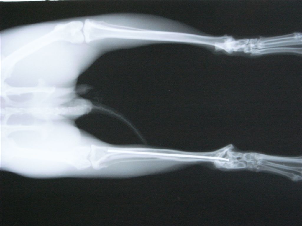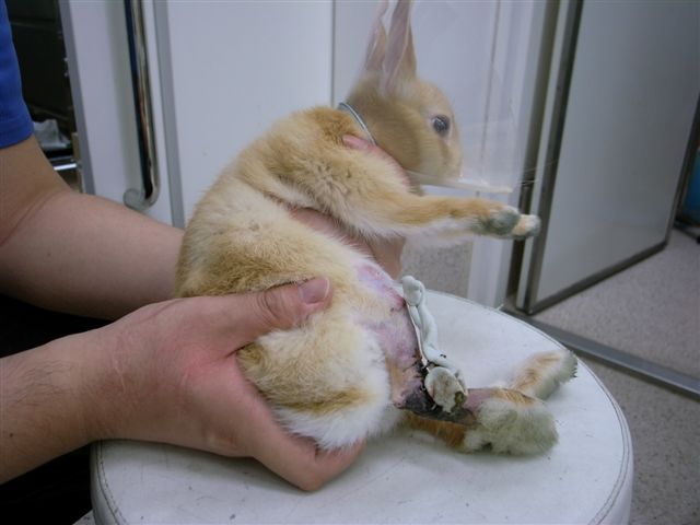 うさぎ、踵の骨折、骨髄内にピンをいれて固定。