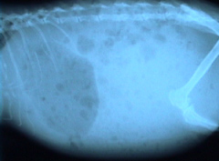 食欲不振で物を食べていないのに、レントゲンで胃内に異物があれば異常です。これは胃内に300ml位の胃液がたまって胃の出口で毛球が詰まってました。 |
