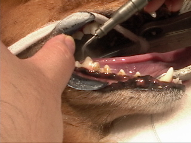 超音波スケーラーで歯石除去 茶色い歯石を水を使いながらきれいにします。気管チューブをいれて人工呼吸で呼吸管理します。麻酔はガス麻酔です。