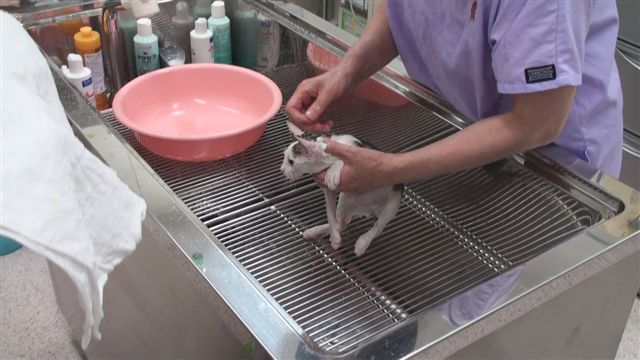 1.からだ全体をぬるま湯でぬらします被毛全体を、まんべんなくぬるま湯でぬらします。 この時、毛玉や毛のもつれなどがないように事前に よくブラッシングしておきます。