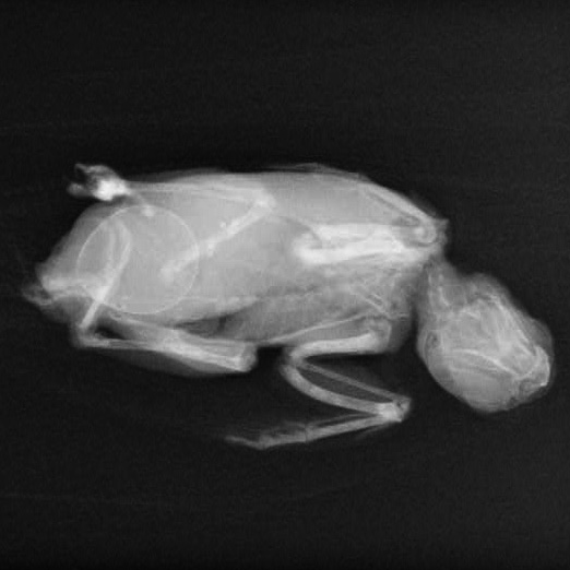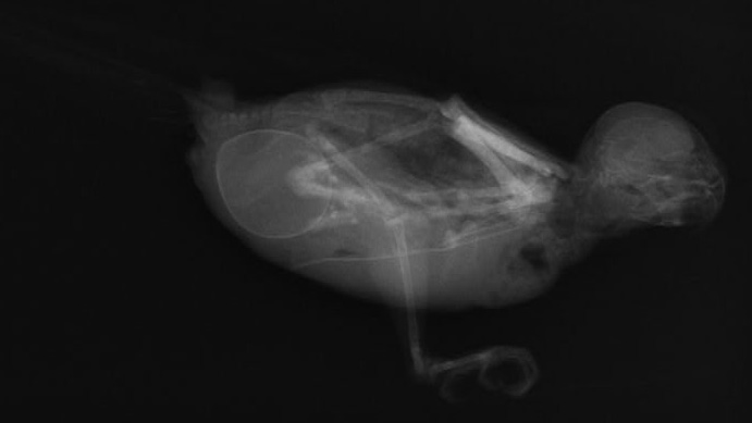 セキセイインコの卵詰まり 卵巣ホルモンの影響で大腿骨などの骨の密度が落ちて脱灰しているのがわかる。
