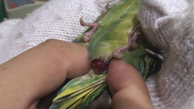 l肛門部を圧迫してみると総排泄口から肥厚した粘膜の塊がみられた。総排泄口に出てきていることから卵肝炎をおこし炎症で腫れていると考え抗生剤と消炎剤の治療を開始した。
